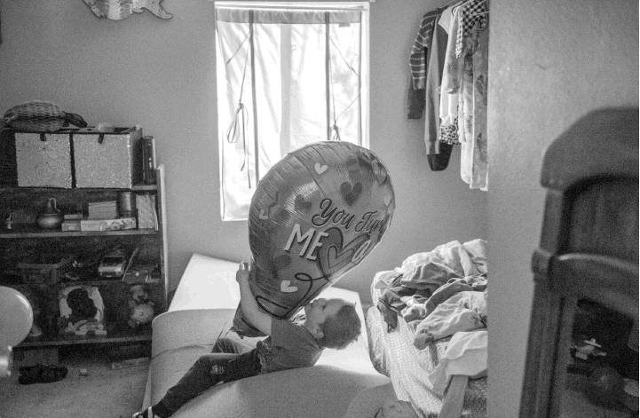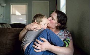 Jenna LeClerc hugs her youngest child Warren, 3, in their Tahoe Park home.